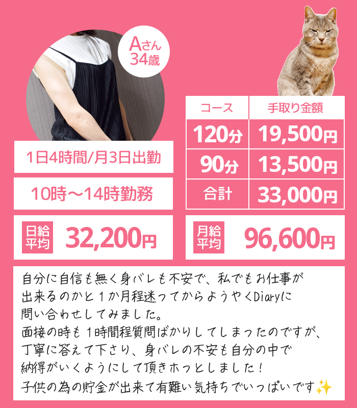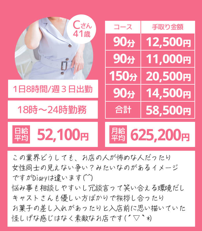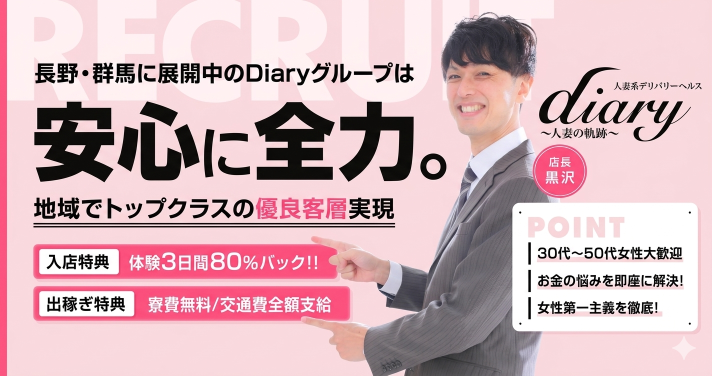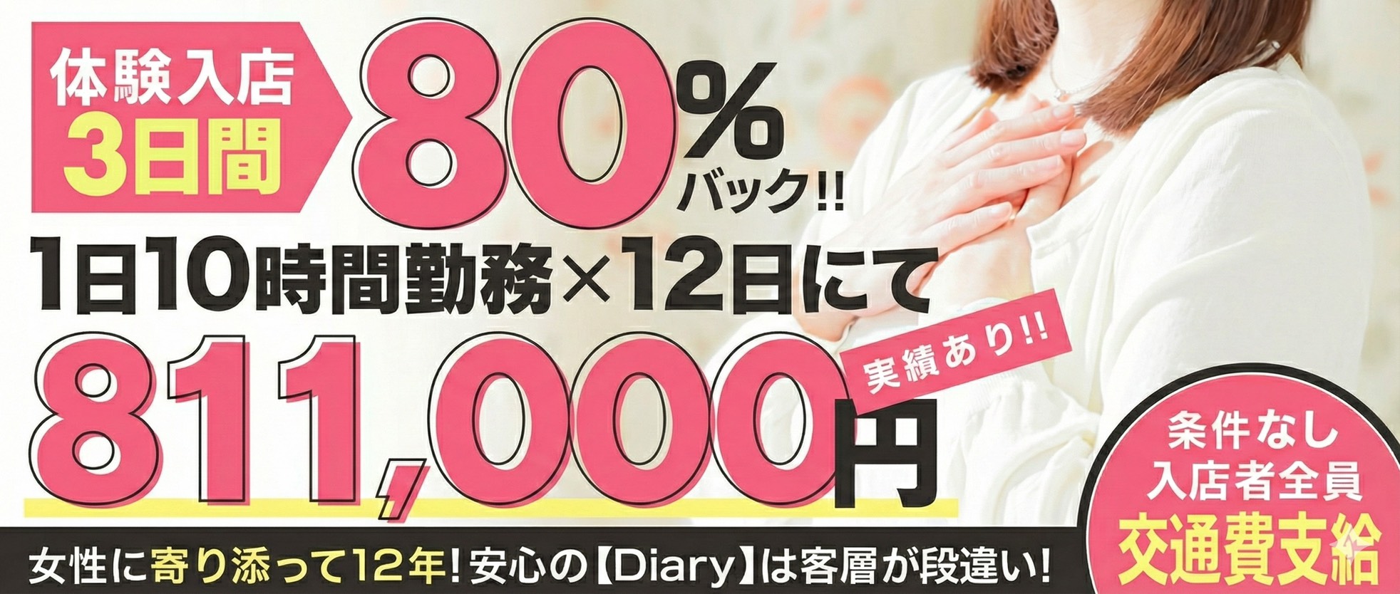 お仕事が初めての方でも安心して稼いで頂けるように当店では、キャストさんの安全を第一とした営業をしています✨ Diaryでは未経験からデビューをされ、今も活躍されている女性も多いのでご安心下さいね(^^)