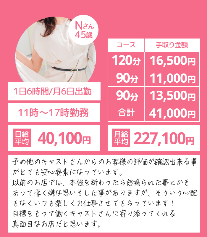 女性に来て欲しいが為に嘘を言うお店が後を絶ちませんが、当店は女性に嘘を一切お伝えしていませんので、体験入店3日間のバック80%は条件特に無しでお渡しさせて頂いていますm(__)m この3日間の稼ぎが20万円を超える方もいらっしゃいまして、当店では入店のお祝い金などはお出しできませんが、当店に来て頂いて「ありがとう」の気持ちを込めまして、80%バックにてお渡しをさせて頂いています! 体験保証もありませんが、最低限の保証の金額よりももっともっと稼げる金額を目指した方が自分にとって+な事が多いですよ! なので当店はずっと保証していませんが、入店して下さる女性がとても多いです!